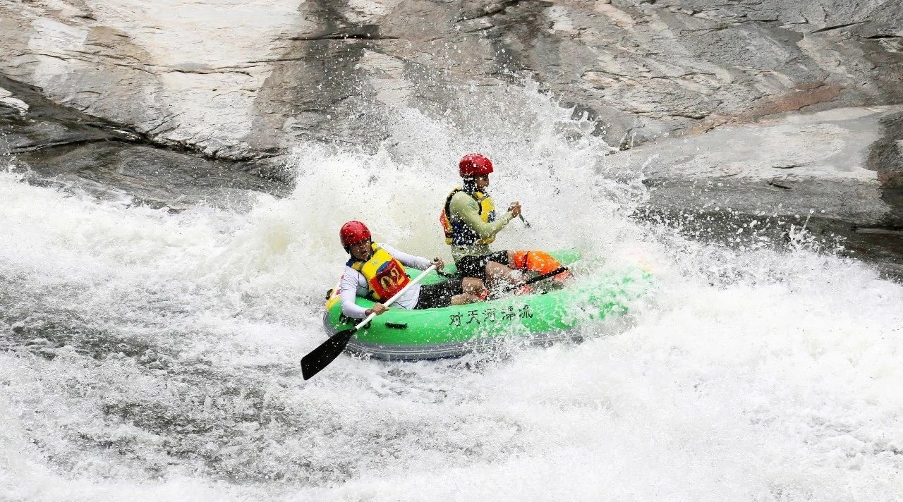 对天河漂流河道全长约5.8公里,途经60道湾,30余个滩,上下游落差143米,单个滩最大落差12米,漂流时间为1.5小时左右。景区内峡幽谷深、滩多浪急,古木参天、怪石林立,峭岩飞瀑、蜿蜒曲折。对天河以其茂密的原始丛林风光、罕见的青石板漂流河床而彰显出与众不同的特点。登上橡皮艇,奔流而下,一路搏激浪、闯险滩、滑奇石,既有乘坐过山车的动感刺激,又有乘滑翔机的畅快淋漓;同时还可以欣赏蔓藤错杂、奇石飞瀑、山花烂漫的丛林风光,品清新空气、吃山珍野味,尽情体验“青石板上漂、绿荫丛中游”的诗情画意……
